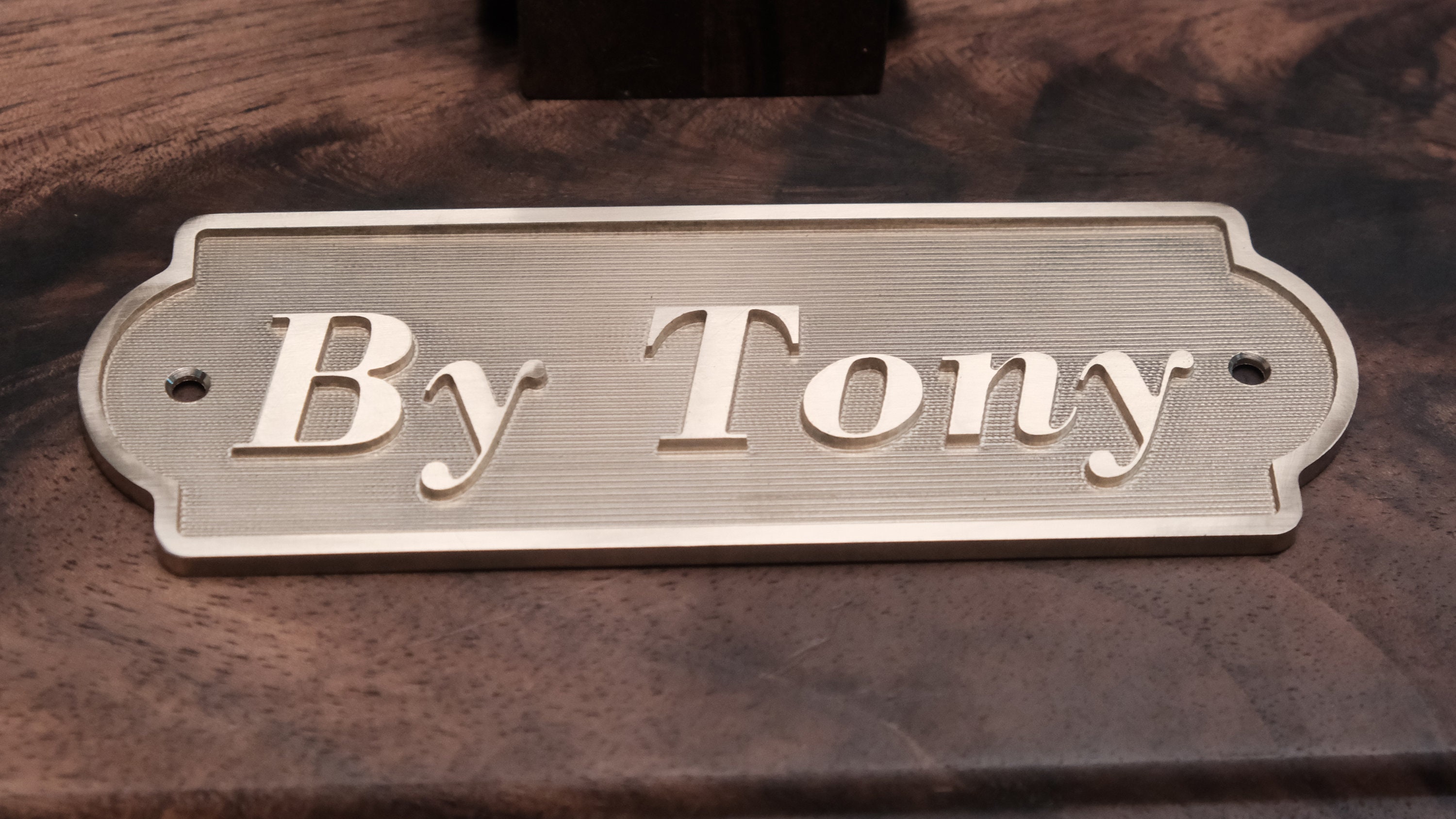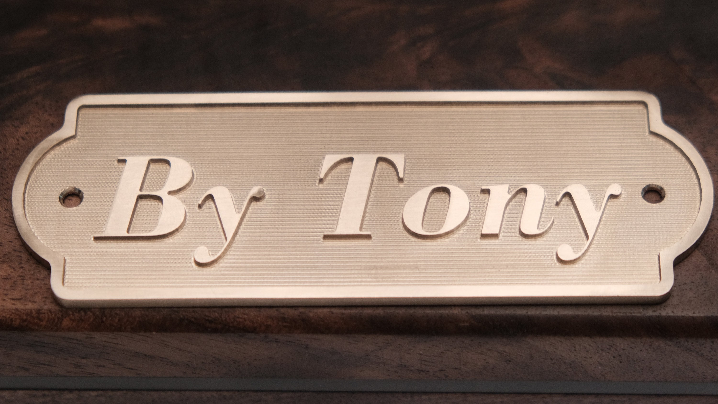 A curated font list is provided, and each mounting hole includes a matching brass screw.