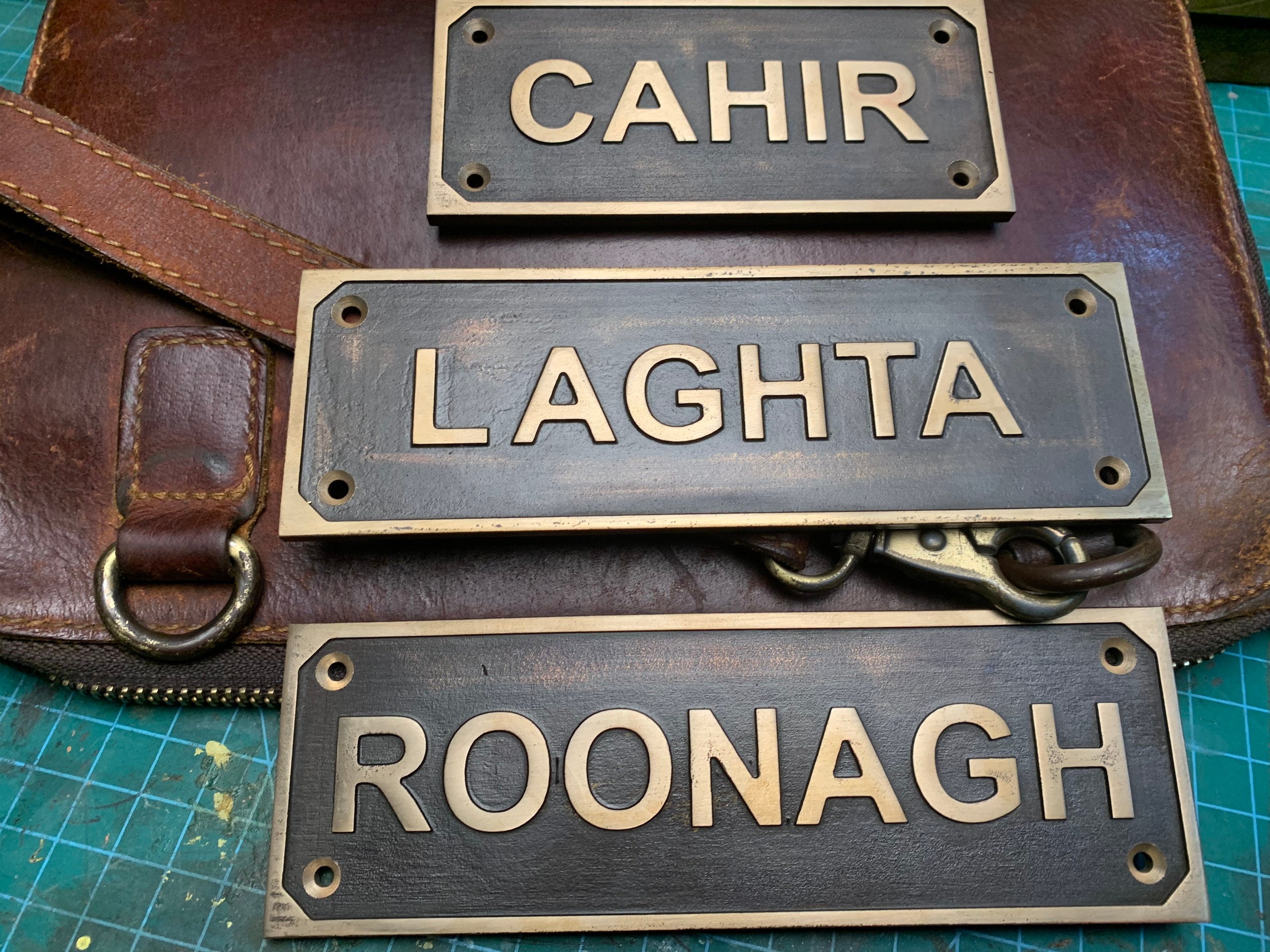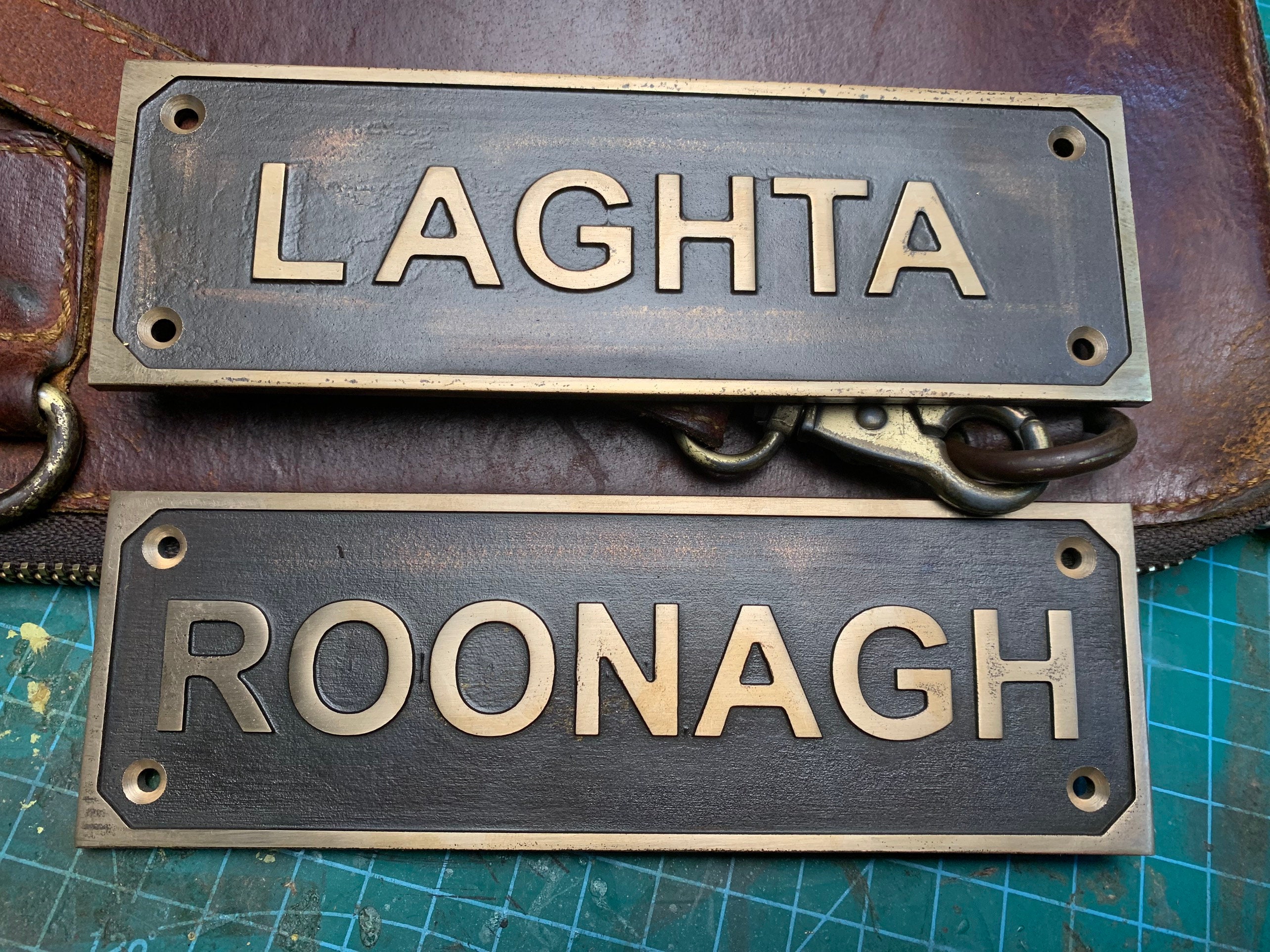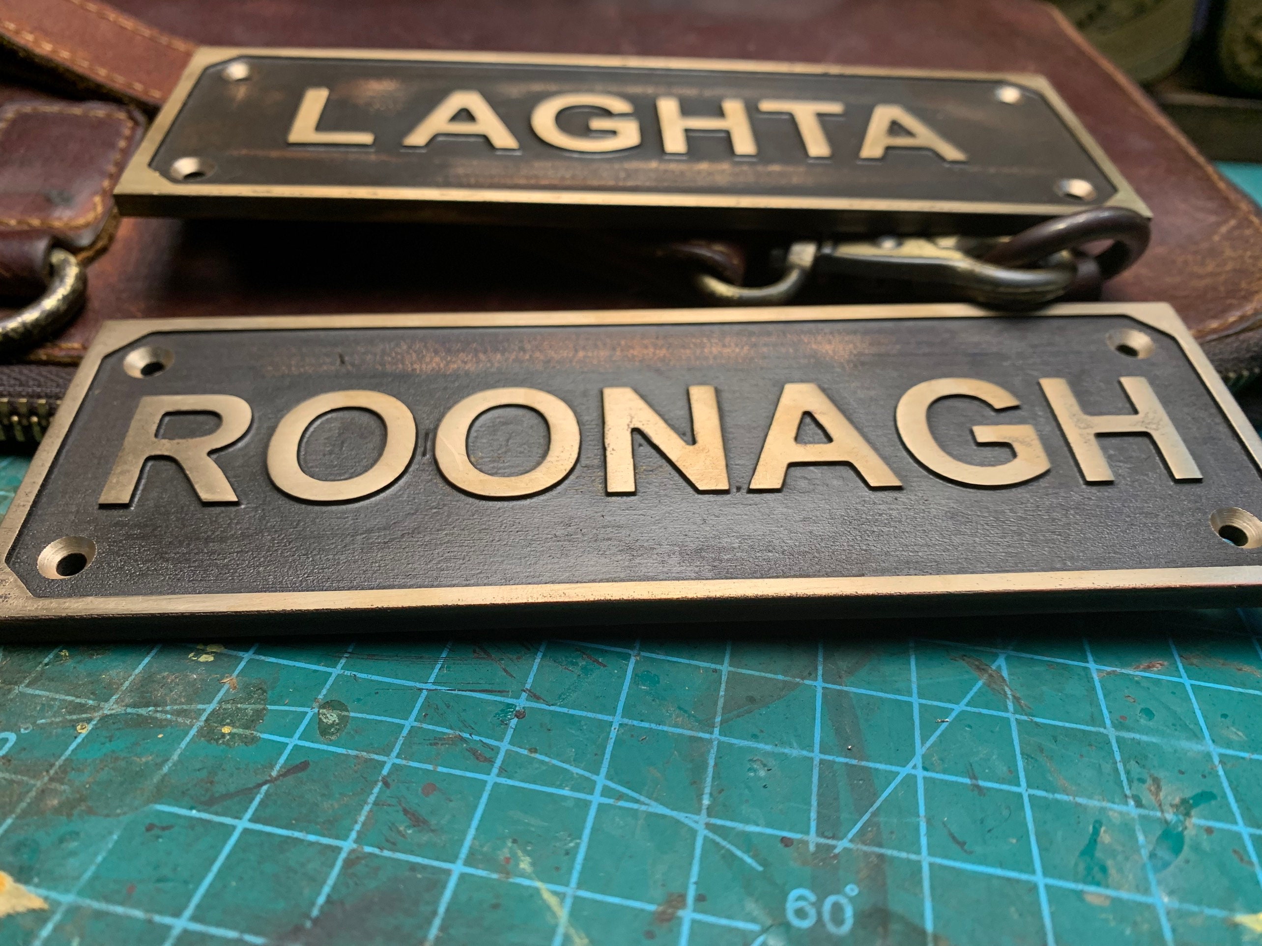 Each order includes a curated font selection and matching brass screws for easy installation on doors or walls.