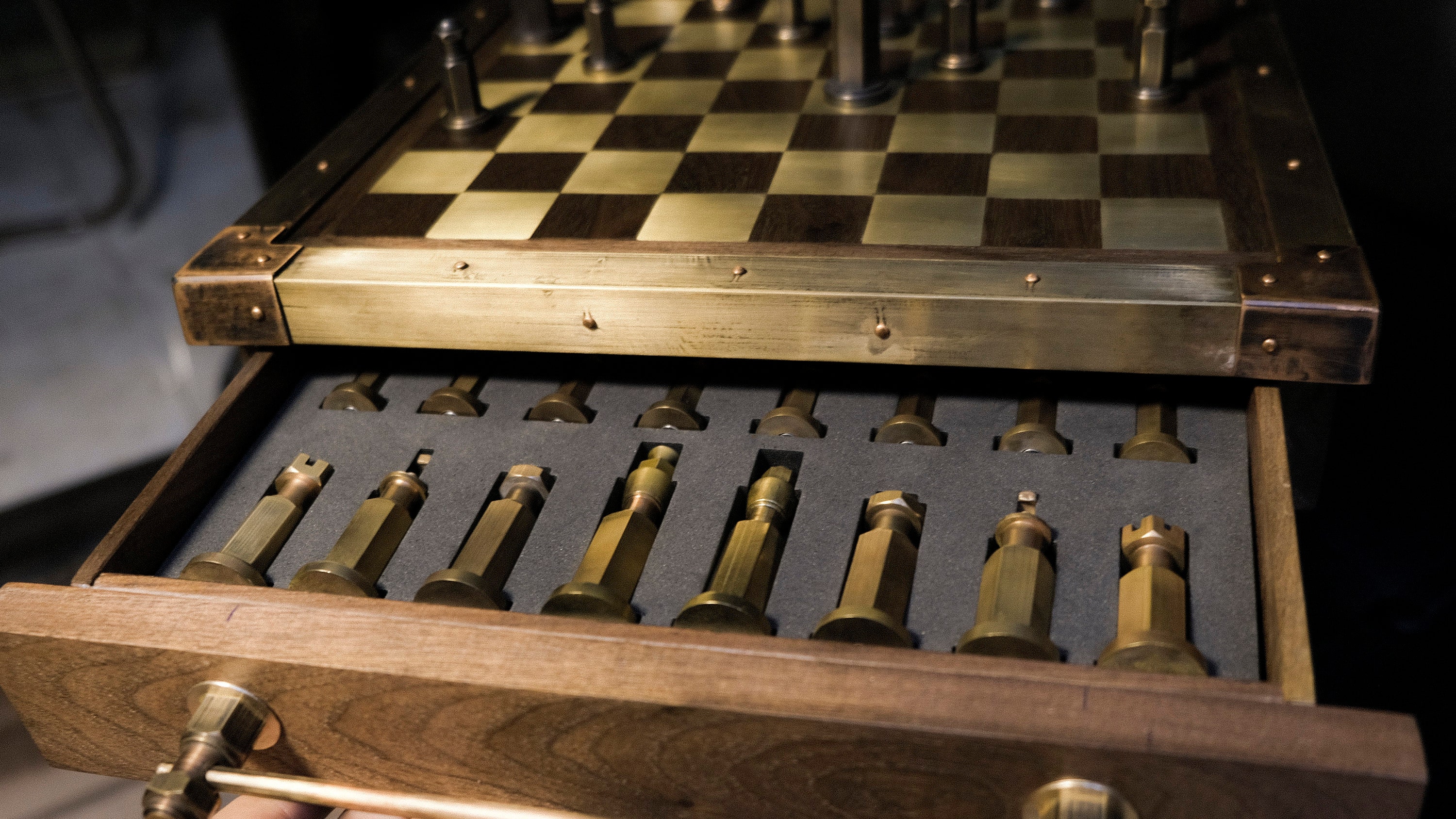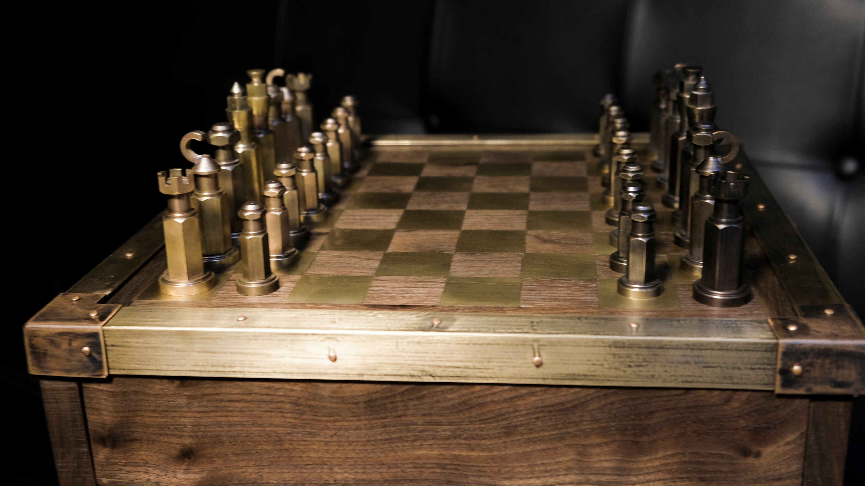 -The chessboard is machined from a combination of walnut and brass, the brass squares are joined together with 32 squares of brass, 1mm thick.