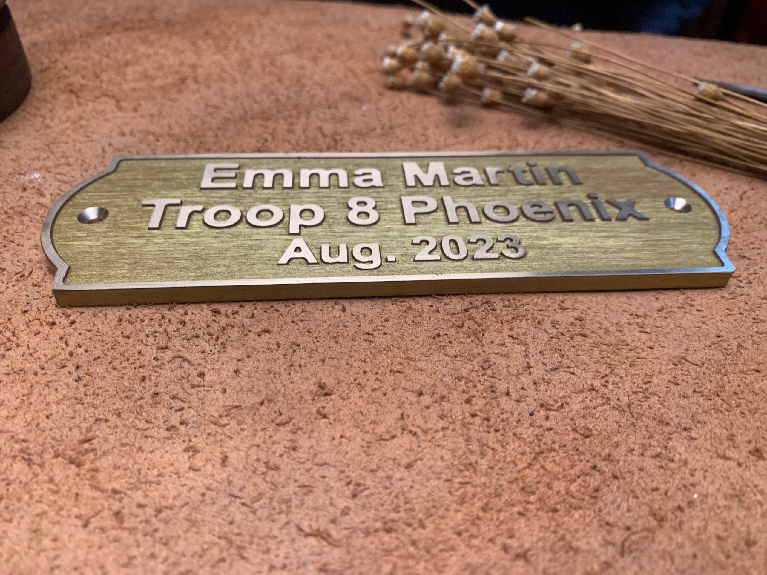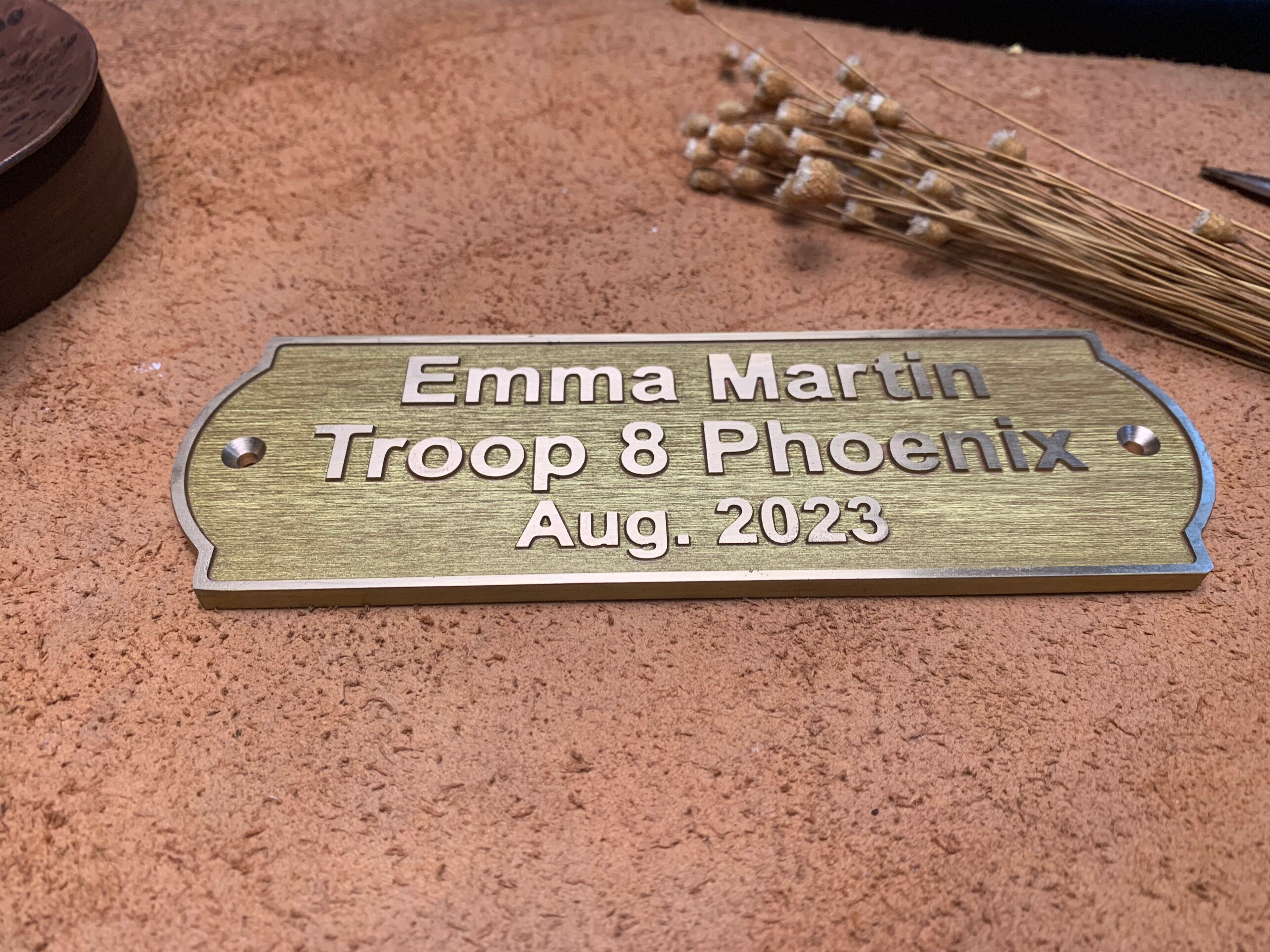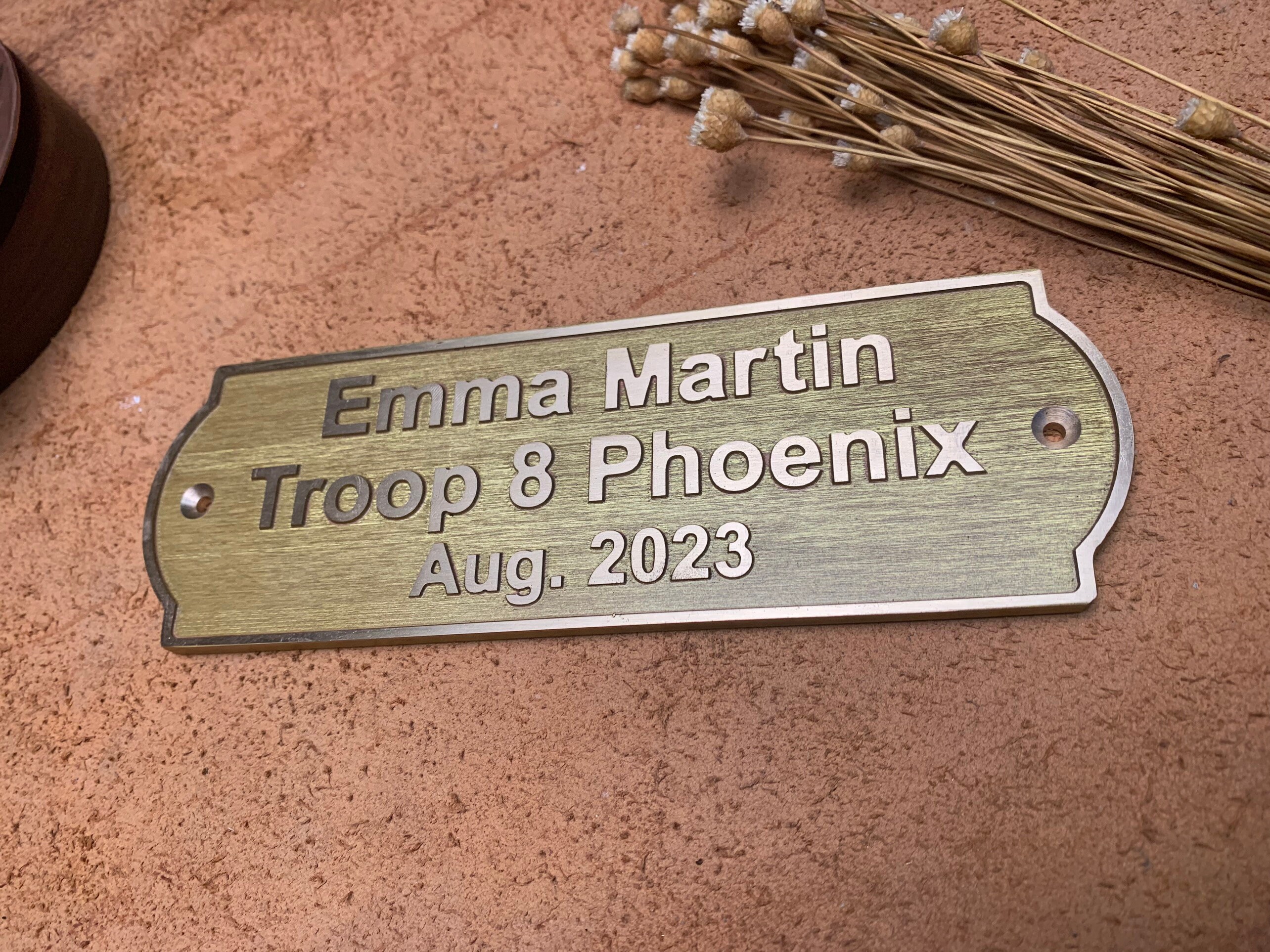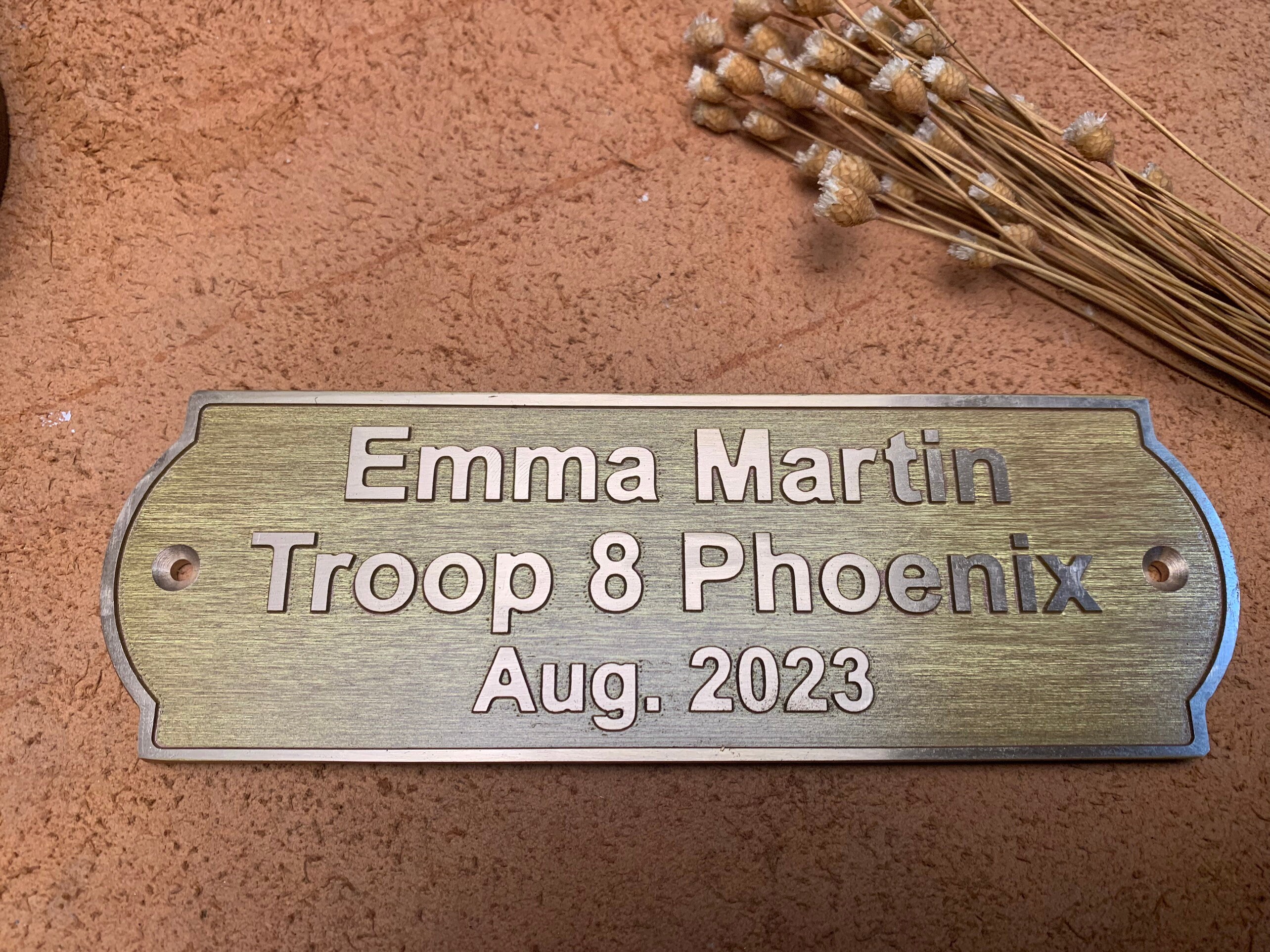 This solid-brass nameplate is perfect for personal nameplates, brand signs, door and exhibition signage, leather tags, machinery labels, artwork plates, and home or street addresses.