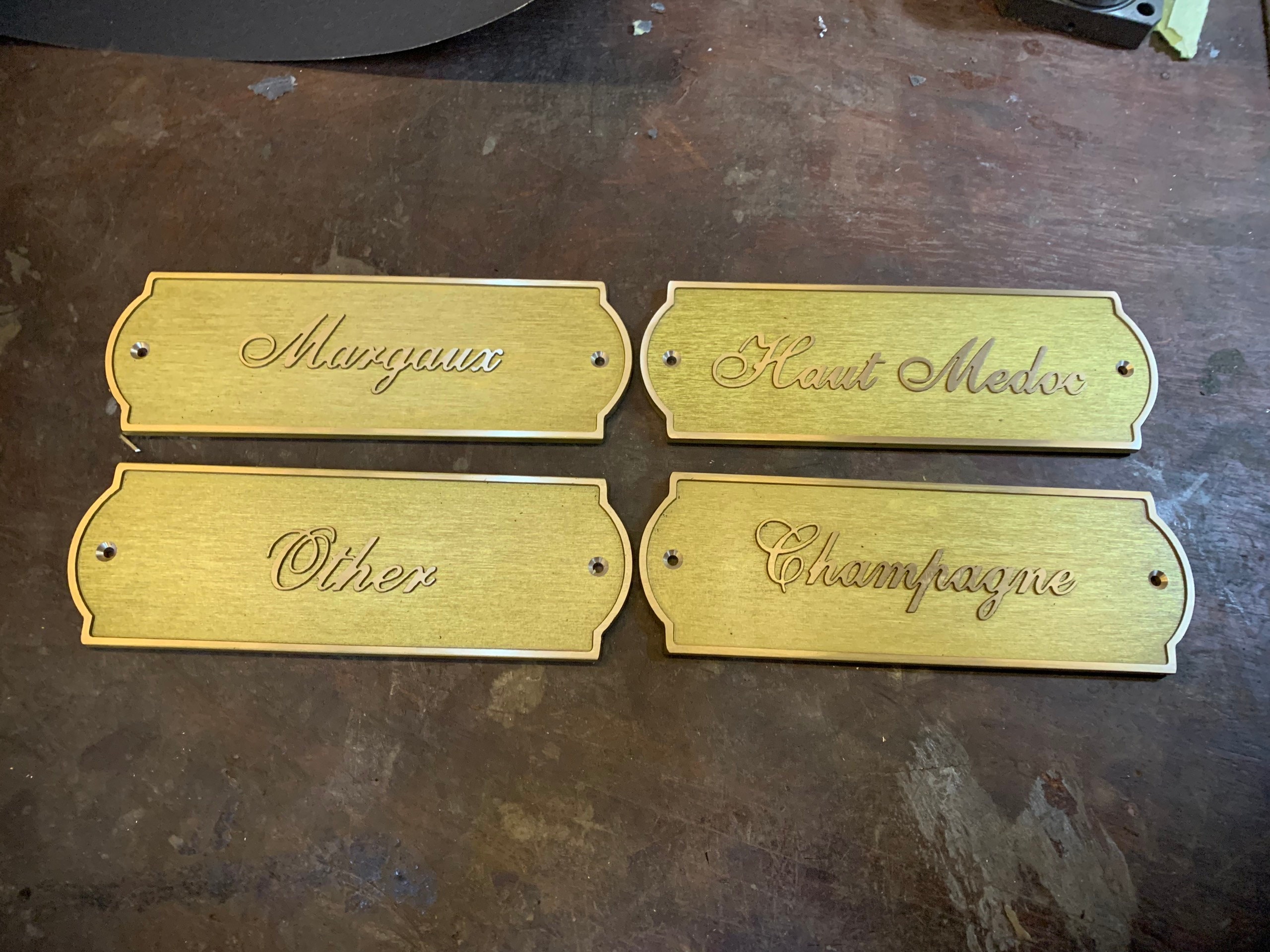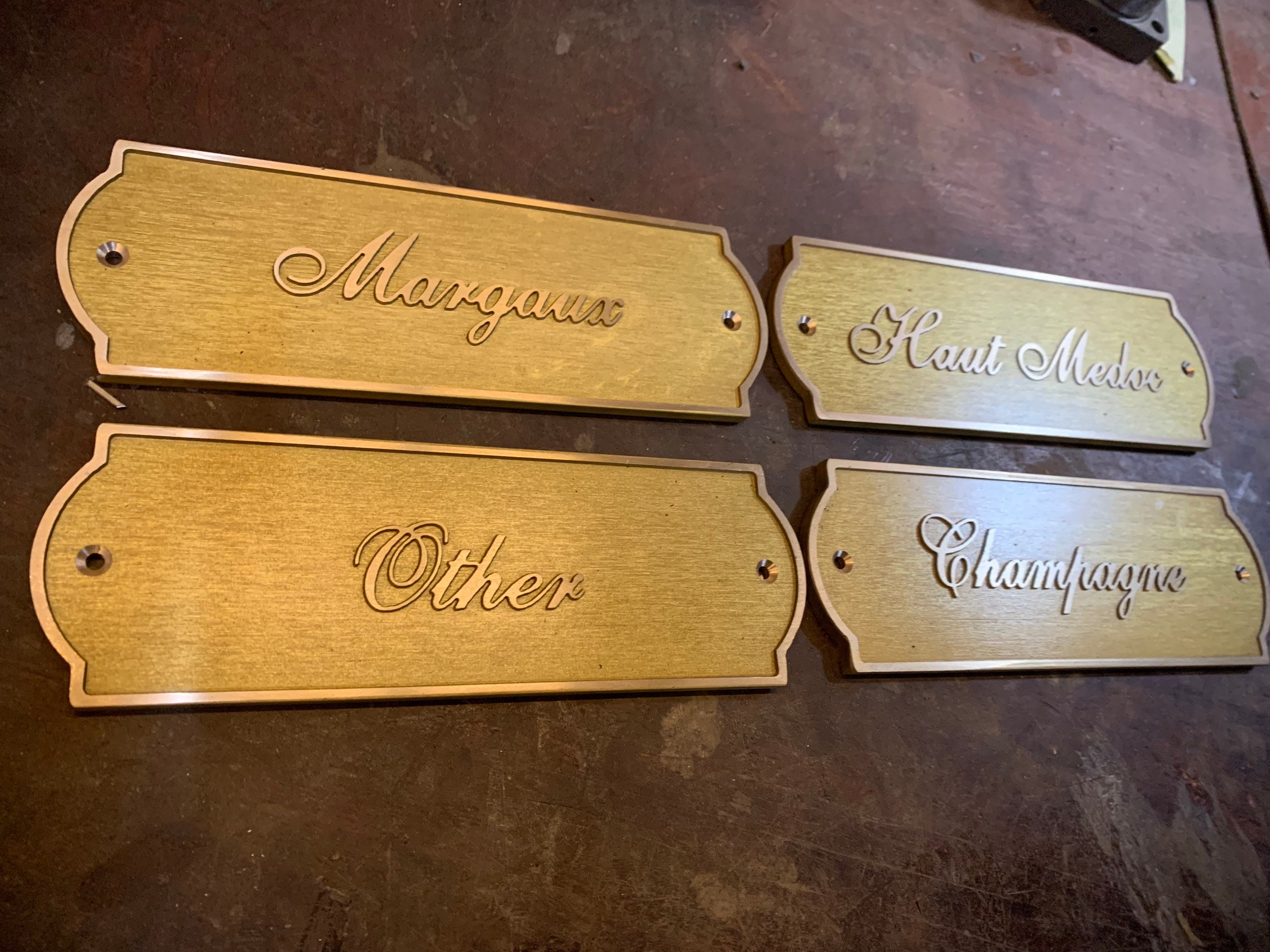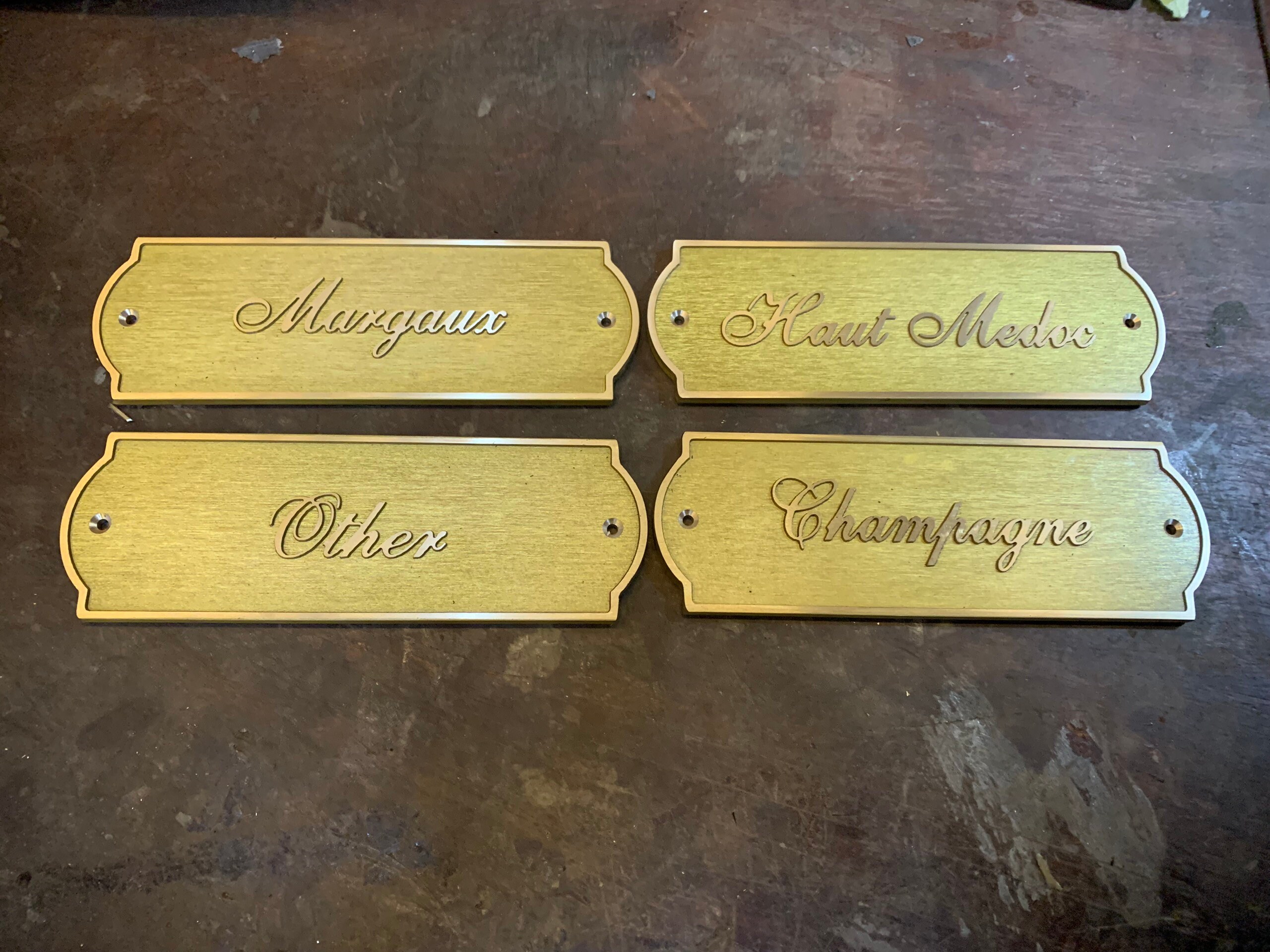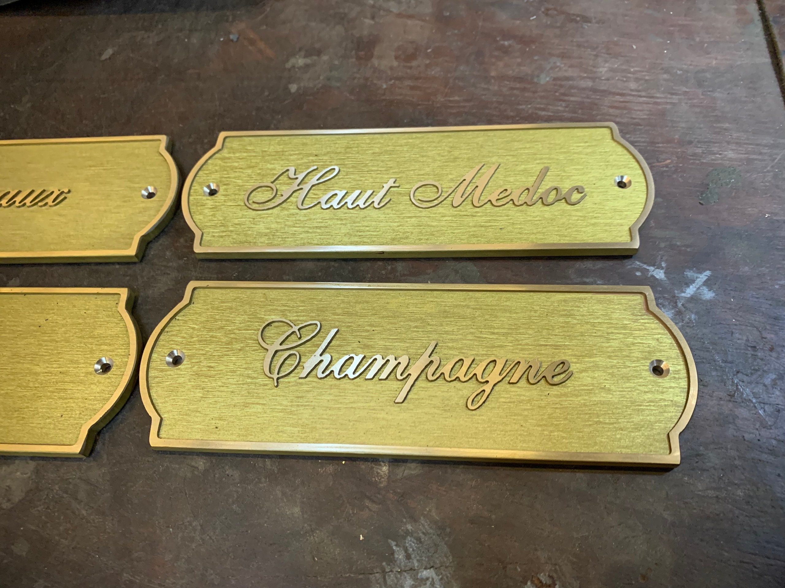 A curated font list is provided, and each mounting hole includes a matching brass screw.